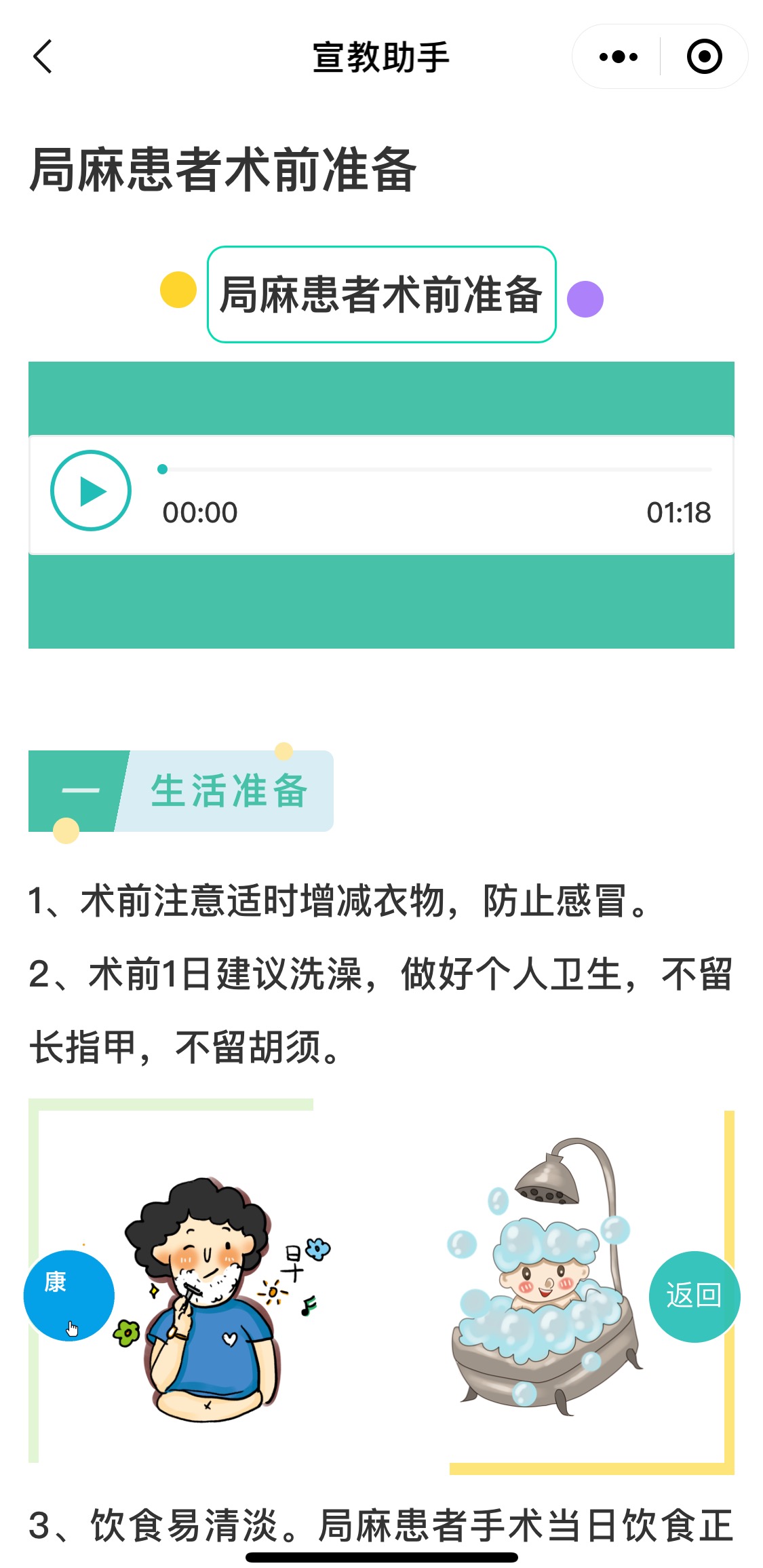 门诊部分:患者就诊时扫描平台的二维码,在移动宣教平台上对门诊的就诊流程进行初步了解和掌握,缩短了滞留门诊的时间,患者按照平台指引及时、高效完成诊疗和术前检查。平台上的视频及音频两种形式可满足不同需求的患者人群。 患者忘记某项检查可以反复观看或者收听语音提示,除常规的术前检查提示外,白内障手术需要在术前三天滴1至3种抗生素滴眼液以预防术后感染发生,每种滴眼液都有不同的用药次数。临床中不少老年患者经常有因忘记滴眼药而停做手术的事情发生。有了此平台,患者可随时调出内容查看。 #01 日间病房:办理住院手续后由日间病房的工作人员核实患者已经准备好的相关检查及术前检查情况是否符合手术标准。在使用移动宣教平台之前,经常有患者忘记携带某项检查结果而影响手术,而使用之后这种现象大大减少。 日间手术:进入手术室后,手术室工作人员为患者进行核对及配合医生顺利完成手术。有的患者对手术室环境比较陌生,加之对手术产生的恐惧而过度紧张,导致与医护人员的交流变得异常困难,日常很平常的一句话在手术室都很难理解,比如,希望患者配合睁眼、闭眼、核对时说出左右眼都能回答错误。在移动宣教平台上线后,患者可提前在线上对手术室的环境和手术过程进行了解,对手术室的恐惧大大减少,手术配合度得到大幅度提升。 在未开设“移动网络宣教助手”平台前,每天都有患者因术前准备不充分而影响手术,造成患者多次往返医院就诊,甚至停手术情况,由此导致患者自身风险的加剧,也增加了医患之间的矛盾。 借助此平台,白内障中心党支部践行“我为群众办实事”,改善了白内障患者的就医体验,提高患者满意度。
